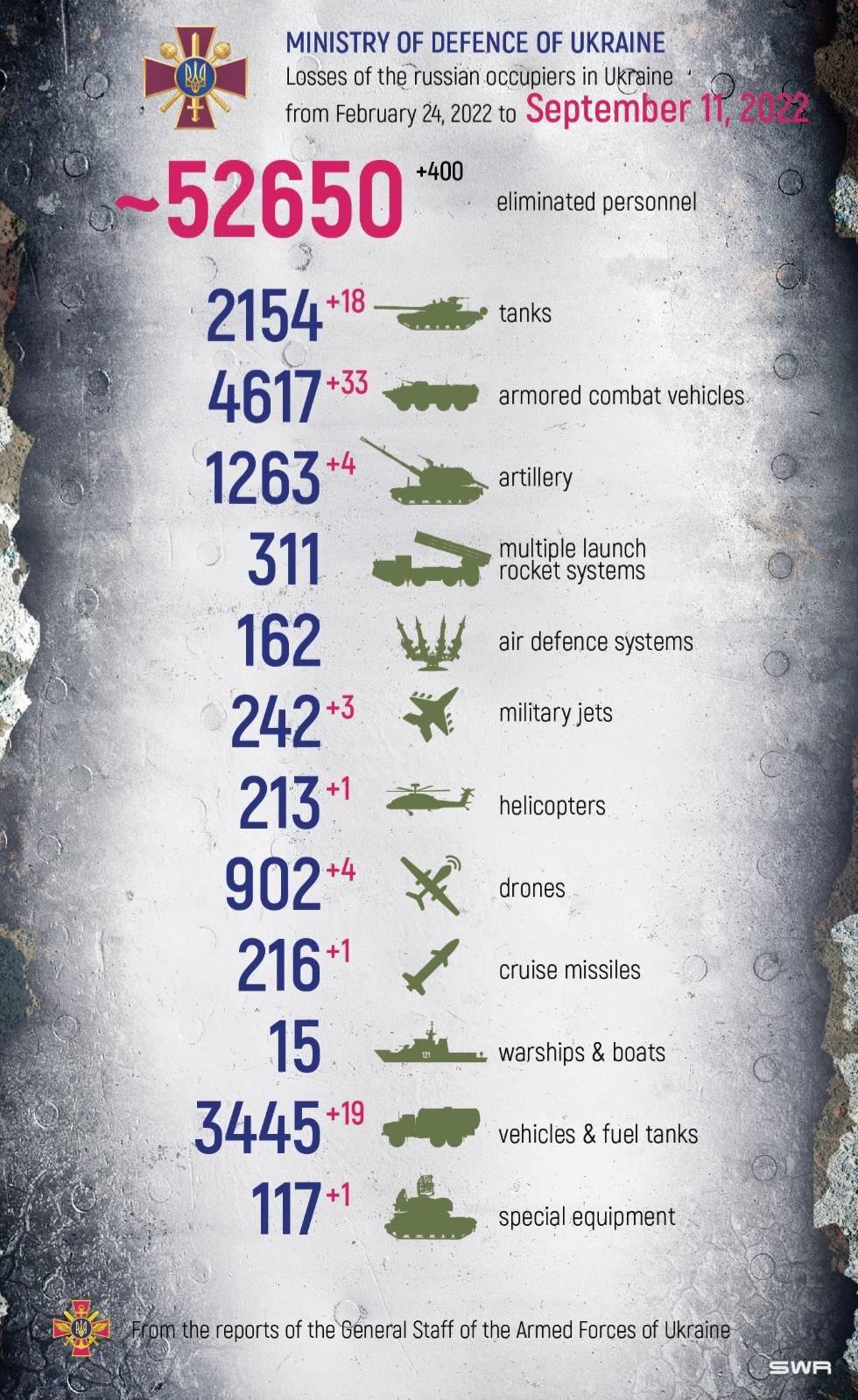 ونشرت وزارة الدفاع الأوكرانية، إجمالي الخسائر القتالية لروسيا منذ بداية الحرب التي بدأت في 24 فبراير الماضي، وجاءت الخسائر كما يلي: